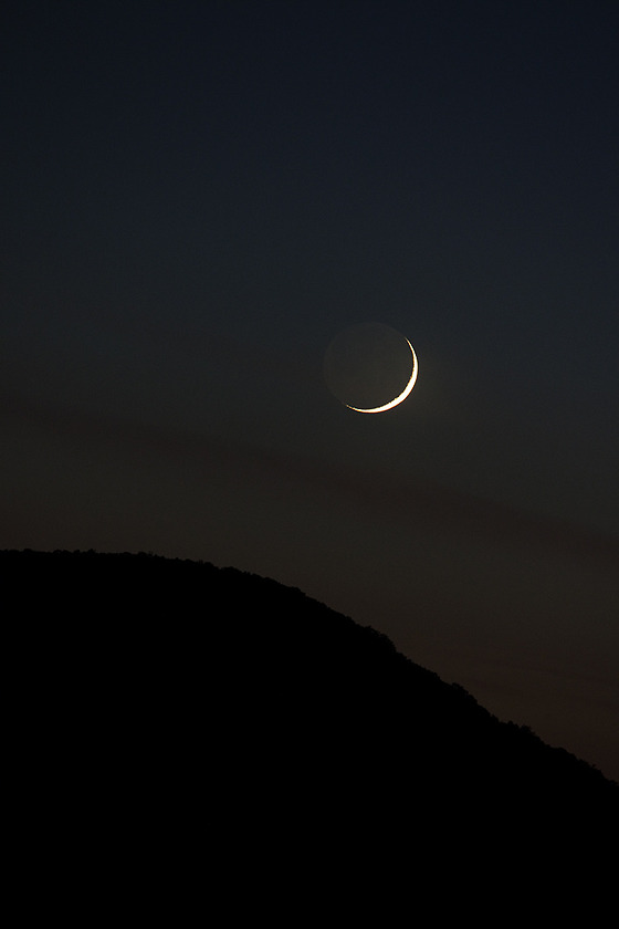 The new moon, viewed from the small small Etruscan village Vetulonia,Tuscany.