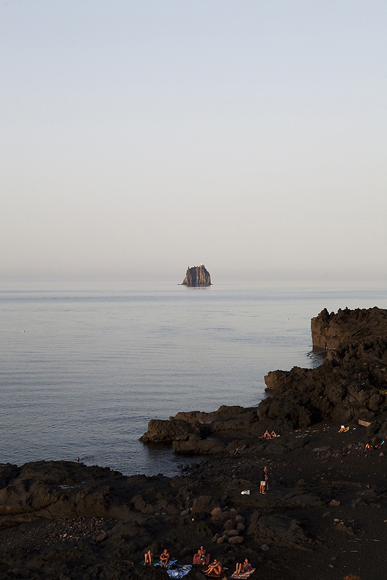 Sunset at the small beach Piscità, on the Island of Stromboli, with Strombolicchio in behind.