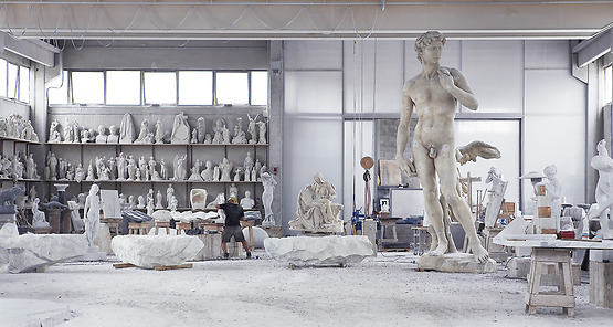 It is year 2007 and a moment of concentration in "Studi d'Arte Cave Michelangelo", Carrara. The David statue is the "calco" in plaster of the marble copy that had just been sent away.